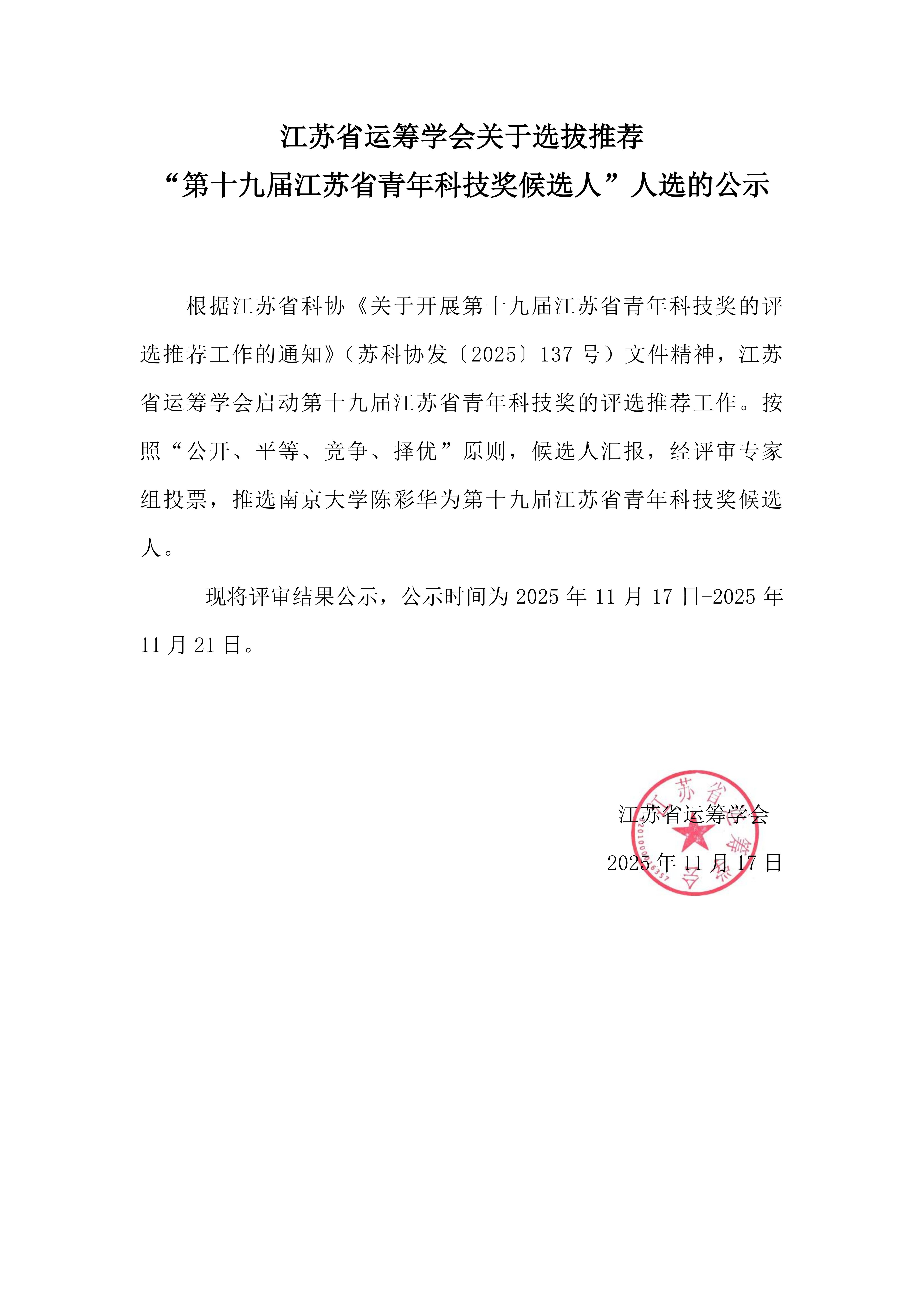 江苏省运筹学会关于选拔推荐 “第十九届江苏省青年科技奖候选人”人选的公示
